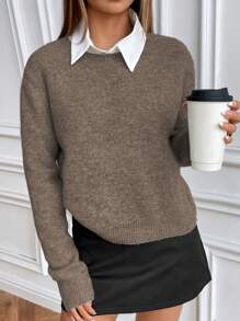 Calvaya Casual Style Solid Color Crew Neck Long Sleeve Knitted Sweater Fall Winter Outfit