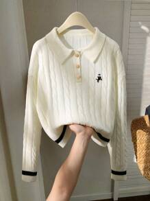 Franclia Color Block Trim Simple Embroidered Horse Head Polo Collar Long Sleeve Knit Sweater Knit Pullover Fall Winter